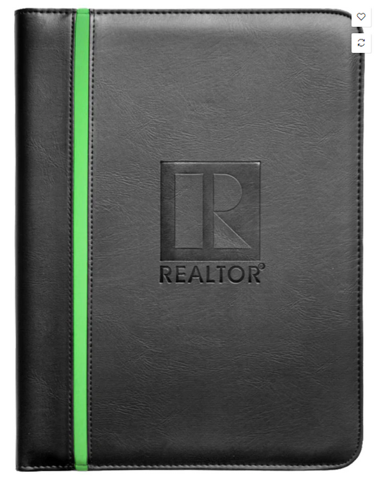 Padfolio Black Leatherette Material REALTOR Branded Logo with a Color Strip down the side inside has serveral pocket areas for paperwork and business card holder pen Assorted Colors (RBPAD RRPAD RGPAD RPPAD)